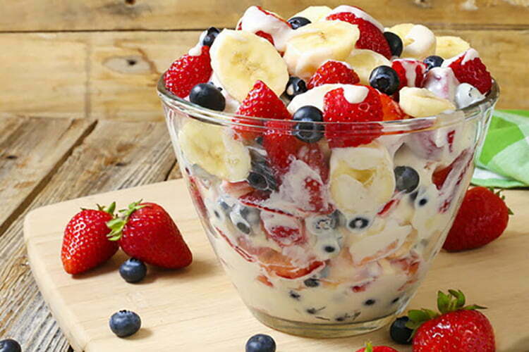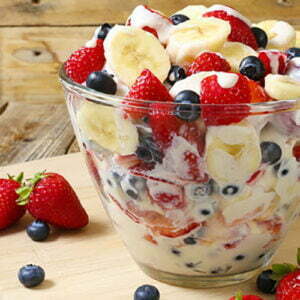 - In a large bowl, combine lemon juice and bananas. Stir to coat bananas completely and pour off any excess lemon juice. Add strawberries and blueberries. Gently stir to combine.