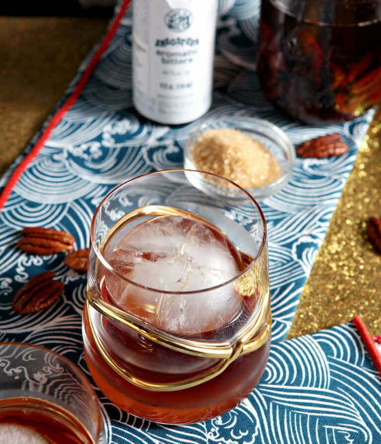 - Place whiskey stones or a large ice cube, then pour the Toasted Pecan Whiskey over the cubes, swirling it to mix with the bitters and sugar mixture.